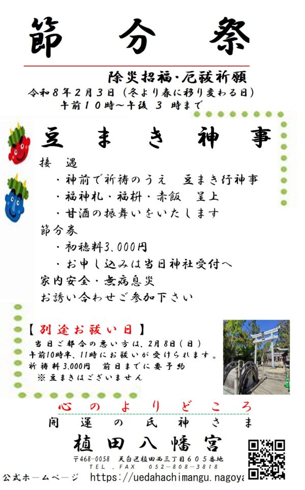 来る令和8年2月3日(火)節分祭を開催いたします。下記ポスターを参照ください。みなさまのご参拝を心よりお待ちしております。