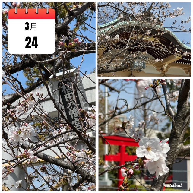 町の中も桜色に染まりつつあります。八幡宮の3月24日現在の桜の様子です。二から三分咲きぐらいとなりましたでしょうか。今週末は結構なボリュームを見せてくれると思います。ご参拝の際にゆっくりとご覧ください。